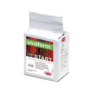EFEKAT NA VINO: Kada dođe do zastoja negde na sredini alkoholne fermentacije, šira generalno sadrži mnogo više fruktoze u odnosu na glukozu koju kvasci preferiraju. Idealno rešenje do sada je bilo upotrebiti kvasac otporan na alkohol sa velikim fermentnim kapacitetom kao što je Lallemand-ov Uvaferm 43 selekcionisan u Inter-Rhône Laboratory (Inter Rona Laboratoriji) u Francuskoj (u dolini Rone). Zahvaljujući procesu pre-aklimatizacije kvasca razvijenom od strane Lallemand-a, testiranom i odobrenom od strane laboratorije Inter Rona povećana je prirodna otpornost na toksične uslove zastale fermentacije. Ćelije kvasca Uvaferm 43 Restart su robustnije i bolje se i brže aklimatizuju posle inokulacije. Proizvođačka receptura sada uključuje i mikronutrijente koji pojačavaju sposobnost opstanka kvasca. U njih spadaju specifični steroli i polinezasićene masne kiseline koji skupa jačaju ćelijsku opnu kvasca. Ćelije kvasca kod ovog proizvoda su robustnije, sa manjom stopom ’’smrtnosti’’ posle inokulacije, a zahtevaju i kraće vreme za aklimatizaciju u širi-vinu.